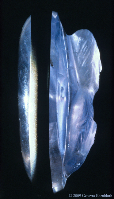 Sapphire cameo of Christ. Byzantine, twelfth century, Constantinople? Details below document the varying height of relief and its effect on light transmission, the straight cuts of a flat engraving wheel, and the facial features and gesture of blessing. Washington, D.C., Dumbarton Oaks Byzantine Collection.