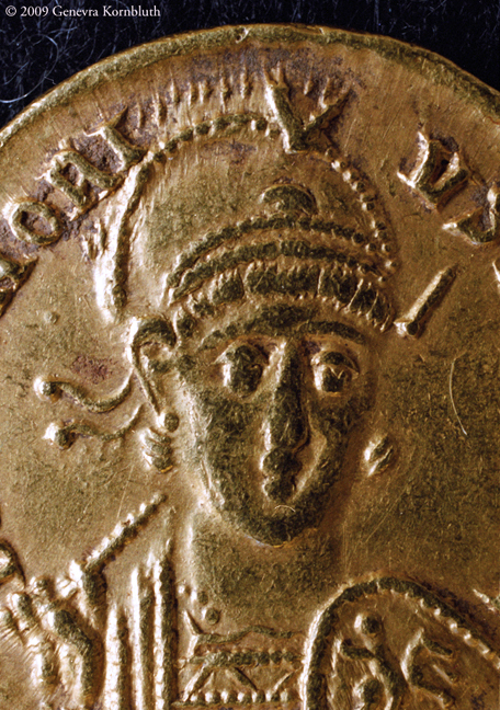 Roman gold solidus of Honorius (384-423). Images below document the obverse bust, the reverse personification of Constantinople, and a detail of the emperor in a crested helmet and diadem tied in the back, holding a spear and shield. Washington, D.C., Dumbarton Oaks Byzantine Collection.