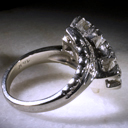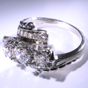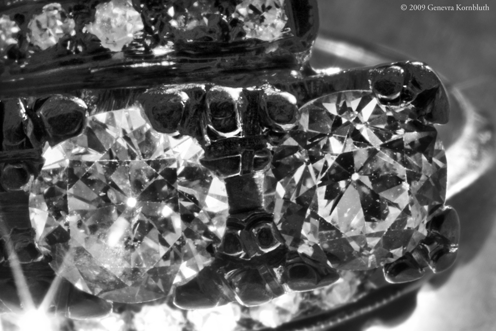 Diamond and white gold ring, early to mid twentieth century. Images below document the proportions, angles, and reflectivity of the larger stones' table, crown, and pavillion facets; and the visual effects of juxtaposed diamonds and metal. Private collection.