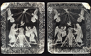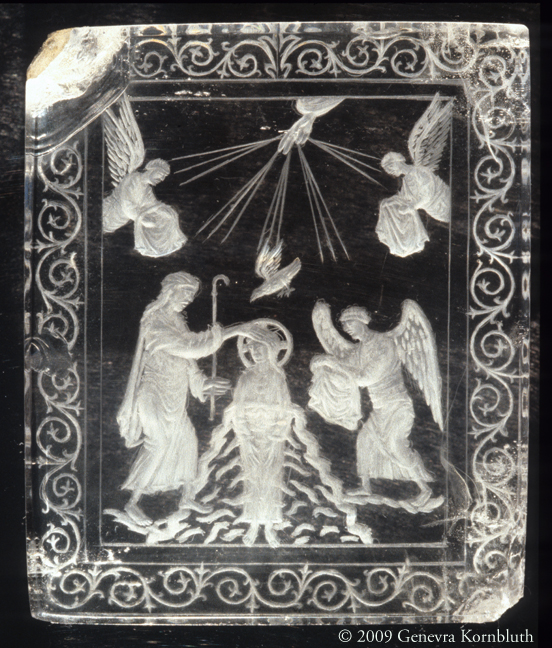 Rock crystal intaglio: Baptism of Christ. Carolingian, c.855-869. Details below document the engraving on the reverse viewed directly and from the obverse, through the stone; the marks cut by a rounded drill; and the artist's preliminary sketching with a hardstone point. Rouen, Musée Départemental des Antiquités.