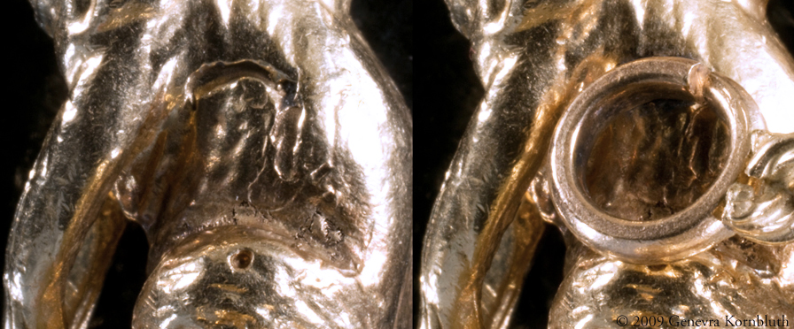 Gold watch fob in the shape of a fox, probably late 19th century. Details below document the attachment of the chain (with an end loop) that linked the fob to a pocket watch, the damage to the fox's side along with the loop that probably caused it, the multiple interlocking links of the chain, and the small fox posed on an American quarter. Private collection.