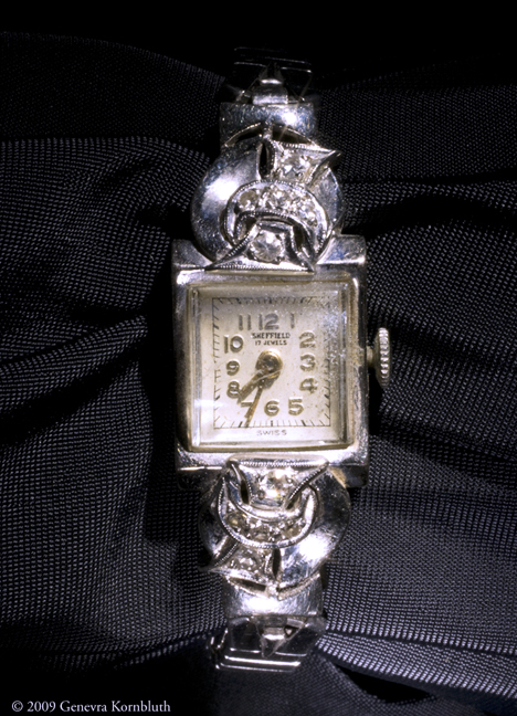 Speidel watch band with Sheffield watch, probably mid-twentieth century. Views to left and below document the jewels flanking the watch face, both sides of the band (showing 'Speidel USA' inscribed on each link), and the appearance of the watch as worn. Private collection.